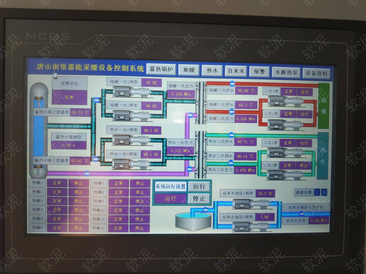 | 1. 項目位于唐山市曹妃甸區(qū),北堡村附近。加壓泵使用變頻器根據(jù)管道反饋水壓自動調(diào)速運行頻率,維持自來水水壓恒定。熱水通過板式換熱器獲得蓄熱水箱的熱能,維持熱水恒溫。 2. 水箱蓄熱功能自動運行,反饋電流異常時能自動顯示故障信息(當?shù)仉妰r沒有峰谷) 3. 制熱時二次網(wǎng)水泵不間斷運行,一次網(wǎng)水泵通過間歇運行給板式換熱器維持恒定溫度,從蓄熱水箱獲取熱源。沒有制冷功能。 4. 所有傳感器和設(shè)備運行數(shù)據(jù)接入軟泥物聯(lián)網(wǎng)系統(tǒng),機房自動運行無人值守,通過手機軟件可隨時查看設(shè)備運行情況和修改設(shè)定參數(shù)。 |
