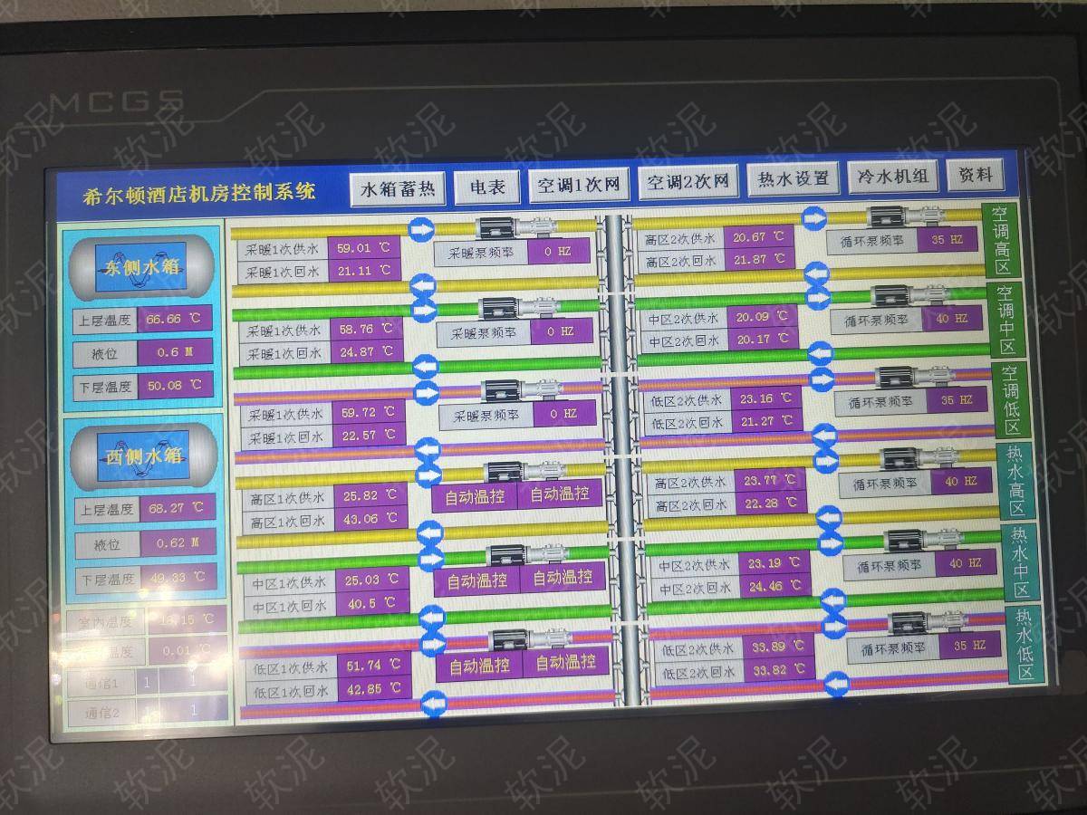 | 1. 項目位于秦皇島市海港區(qū)河濱路92號希爾頓歡朋酒店,功能包括谷電蓄熱(兩個續(xù)熱水箱)、谷電蓄冷(給消防水池降溫蓄冷)、熱水循環(huán)、空調(diào)水循環(huán)。 2. 蓄熱期間兩個蓄熱水箱各自溫控,蓄冷期間中央空調(diào)給消防水池降溫,只在谷電價格期間運行,節(jié)約電費。 3. 高區(qū)中區(qū)地區(qū),有各自的熱水循環(huán)泵和空調(diào)循環(huán)泵,水壓不同,各自的水循環(huán)系統(tǒng)獨立溫控。 4. 自動模式根據(jù)設(shè)定參數(shù)能自動啟停設(shè)備,手動模式可以直接操作每個設(shè)備啟停用于檢修。 5. 機房24小時有人值班,每人實名制賬戶,操作記錄自動存檔。設(shè)備分布在地下一層和地下二層的很多房間,通過軟泥物聯(lián)網(wǎng)平臺能夠統(tǒng)一管理,直觀的看到所有傳感器和水泵的反饋數(shù)據(jù)。 6. 所有功耗較大的設(shè)備都加裝的電表,進行電流檢測和耗電量統(tǒng)計,自動抄表,可檢索,數(shù)據(jù)可導(dǎo)出Excel文件下載。 |